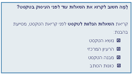 ד. קראו את השאלות בסוף הטקסט - כך תוכלו להבין בערך על מה מדובר בטקסט ולאן לכוון את עצמכם בקריאה שלו!
